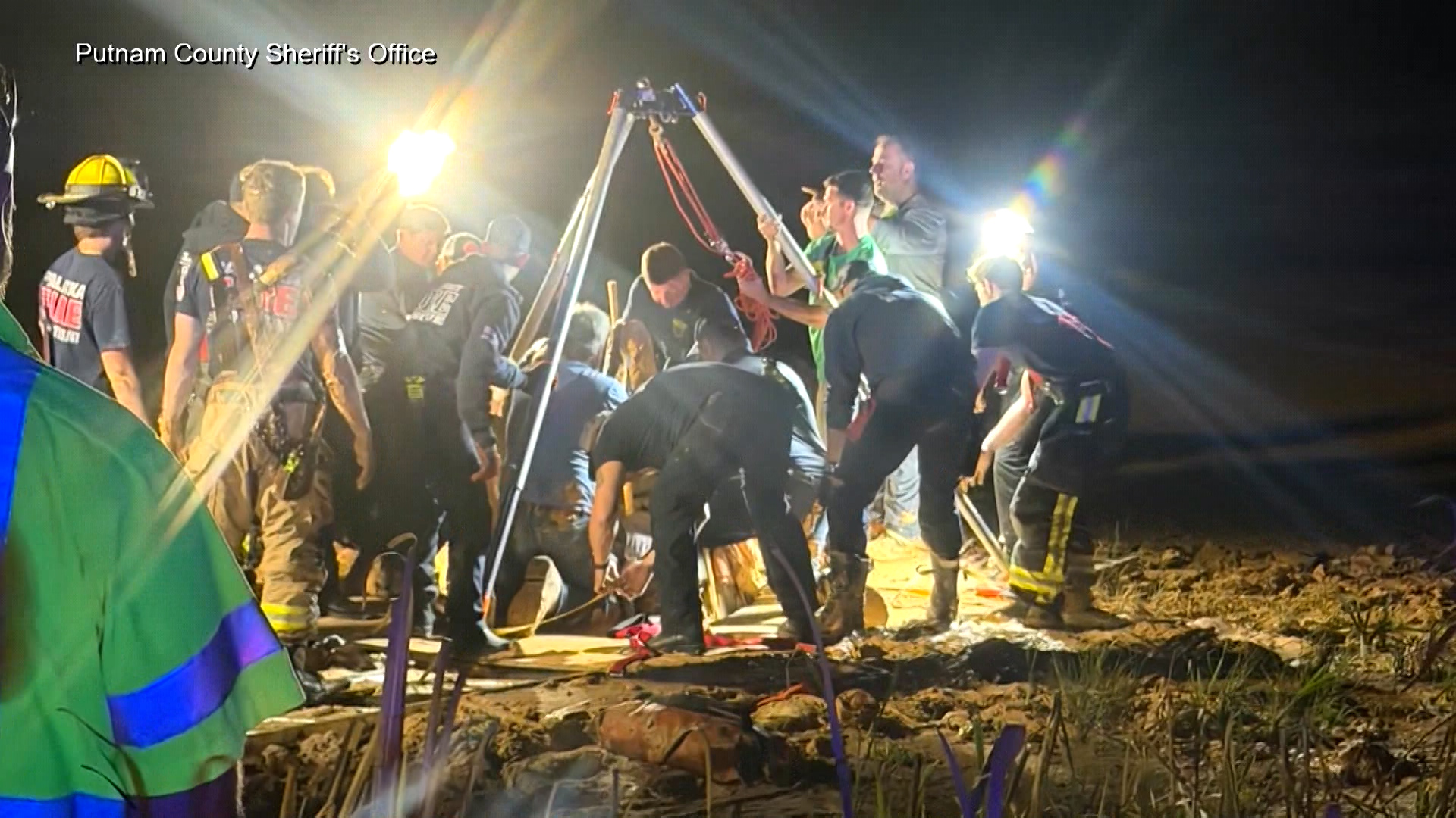 Footage of the incident showed rescuers maneuvering ladders and working to pull the man free using ropes, wood pallets and various tools.